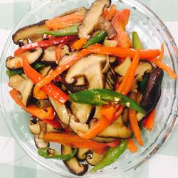 3. Heat the pan, add oil, stir-fry minced garlic, add shiitake mushrooms, add some light soy sauce, stir-fry, add green and red peppers, stir-fry until cooked