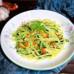 6.Add shredded potatoes, cucumber and red pepper and stir-fry evenly