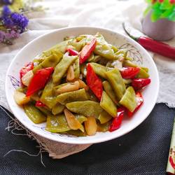 8. Stir-fry the lentils until they change color, add salt and stir-fry evenly , then cover and simmer for three minutes, flipping several times in the middle, being careful not to burn it.