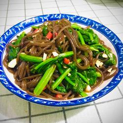 4. Cut the spinach into inch-long sections, put it into the boiling water with fern root powder, and blanch it Fish it out until it is dead.