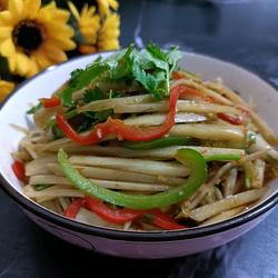 5. Pour in the shredded lotus root and cook for one minute, then add the shredded red and green pepper and cook for a while Will