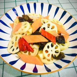 3. After putting the carrot slices in for half a minute, add the lotus root slices.