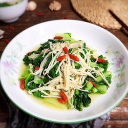 8.Add enoki mushrooms and wolfberry , stir-fry evenly