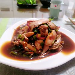 6.Put green peppers and onions in a cold pot, pour light soy sauce and mature vinegar, and heat over low heat ( Do not boil, 5 green peppers and onions are delicious when mature), add the torn chicken legs, sprinkle with coriander leaves, drizzle with sesame oil and mix well.