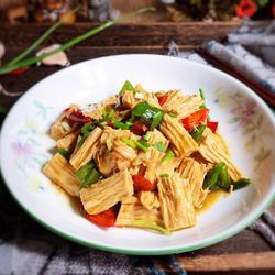8.Add red pepper and yuba, stir-fry until the flavor is absorbed