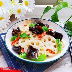 9.Pour in the lotus root slices and fungus and stir-fry evenly
