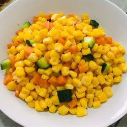 2. Heat the oil in the wok, add corn kernels, diced carrots, and diced cucumbers.Quickly stir-fry evenly.