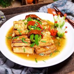 8.Put in the tofu and fry over medium heat until fragrant.(Do not move the tofu before turning it over.You can only shake the pot gently.) Flip over and fry again.Until both sides are golden