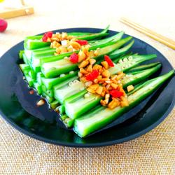 Put okra in a small spoonful of salt and blanch it in water.The color of the vegetable will be bright green.Take it out immediately and let it cool.The okra will be crisp and refreshing.