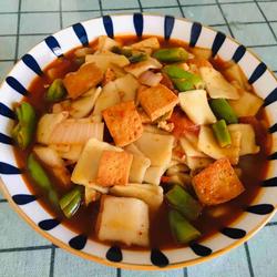 3. Heat oil in a wok and fry tofu until slightly yellow.