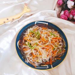 8.Put mung bean sprouts, carrot shreds and green pepper shreds into the plate.