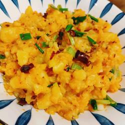 5.Stir-fry with seasonings When fragrant, add mashed potatoes, add salt, stir-fry for 3-5 minutes, then add spicy chicken or chili oil, mainly for good looks, and finally add minced green onions or fennel and it's done