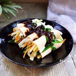 13.Spread out the tofu skin, add shredded blanched vegetables, and roll it into a roll