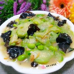 7. Then add the loofah and black fungus and stir-fry evenly.