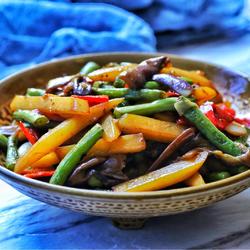 6.Pour the potato strips, eggplant strips and beans into the pot, stir-fry over medium heat until cooked