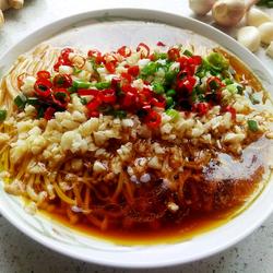 9. Pour the fried minced garlic on top of the enoki mushrooms