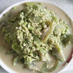 13. Cook for two minutes, let the loofah absorb the flavor, then add chicken essence and it is ready to be cooked
