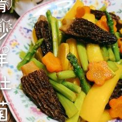 1.Wash the morels, cut the asparagus and yellow peppers and set aside