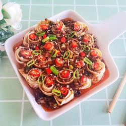 11.Pour the prepared sauce on the tofu skin rolls, sprinkle with chopped green onion and millet pepper and serve