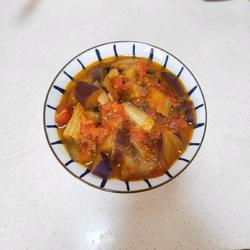 4.Pour in an appropriate amount of water and simmer for a while until the tomatoes and eggplants are soft