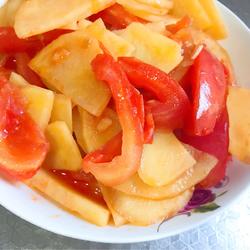 Cut the tomatoes into small slices, put them into the pot with the potatoes, and stir-fry over medium heat for eight minutes.If the potatoes stick to the pot, you can add a little water.Let almost all the tomato juice penetrate into the potatoes, making it more sour and delicious~