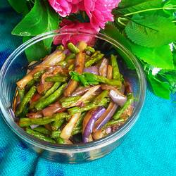 5.Put an appropriate amount of oil in the pan, heat it up, add the eggplant, fry until soft and serve., then add in, stir-fry the beans until soft and serve.