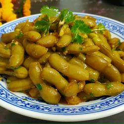 6. Put the beans in the pot, add more water, add some rice wine, star anise, peppercorns, bay leaves, bring to a boil and turn to low heat.Cook for 20 minutes, add a teaspoon of salt and continue cooking for about 10 minutes until the edamame is cooked