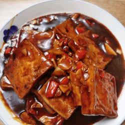 4.Place in the pot Heat the oil until it is cooked.Add the garlic, red pepper and ginger noodles into the pot and stir-fry until fragrant.Add the fried tofu and stir-fry for half a minute.Then pour water into the pot