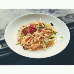 2. Prepare the ingredients, cut dry and green peppers into thin pieces, cut the sausage into small pieces, and mince the garlic., remove the shredded potatoes from the water and drain