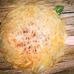 2. Heat the pot, add cold oil, add a little salt to the bottom of the pot, then add shredded potatoes, flatten them and round them.Small fire