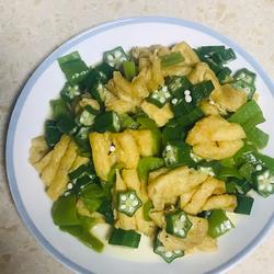 1.Turn on medium heat, add some cooking oil and fry the okra, green pepper and fried tofu together