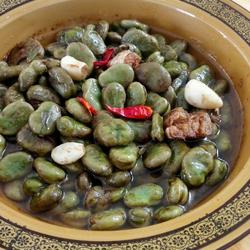 6. Heat the oil in another pan until it is hot, and add the small and medium-sized broad beans that have absorbed the juice.Simmer for about half an hour until the beans are soft and crispy.It is better to simmer in a casserole.