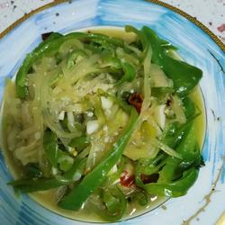 3. Add gourd strips and green pepper shreds and stir-fry.