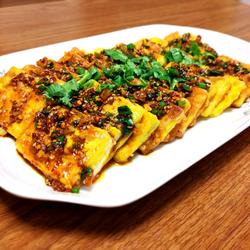 7.Pour the prepared conditions evenly onto the tofu, this spicy and delicious dish The pan-fried tofu is finished.