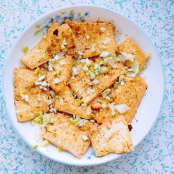 6. Add tofu and fry , fry for two minutes and flip it slightly to avoid sticking to the pan, or don't flip it, just move the sticky area.Sprinkle a thin layer of salt on one side until golden brown, then fry the other side, and sprinkle a thin layer of salt on both sides.Once golden, use chopsticks to take it out.Pour the remaining oil into a bowl.Use a spoon to take out the minced green onion and garlic.The oil will be used for cooking next time