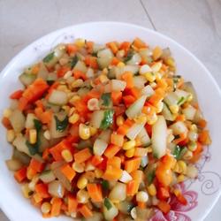 4. Heat the pan, add the oil and stir-fry the carrots until half-cooked and then add the cucumber.Ding corn kernels