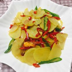 5. Fry the potato slices until half cooked, add green and red peppers and add hydrochloric acid vinegar