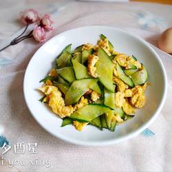 6.After the egg liquid has solidified, scrape it to the edge of the pot, add the cucumber slices and stir-fry for one minute, scrape the cucumber and eggs together and stir-fry.