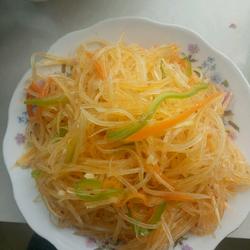 6. Put the potatoes in the pot after controlling the water In the middle, put shredded green peppers, shredded carrots, onions and garlic sprouts, chopped garlic, chicken essence, monosodium glutamate, salt, sesame oil, white vinegar, and chili oil around it.Heat the oil in a pan until it is cooked and smoking, then pour the oil on the garlic.Take a pair of chopsticks and mix well.