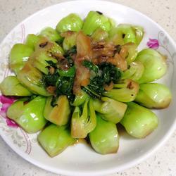 3. Stir-fry the washed Shanghai greens in a pot over high heat , pour a little soy sauce and oyster sauce and continue to stir-fry, put a little water in a bowl, add a little cornstarch and mix evenly, pour it along the edge of the pot, stir-fry for a while to reduce the juice and remove from the pot!