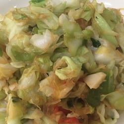 4. Fry onion, ginger, garlic and chili until fragrant.Add cabbage and stir-fry until cooked.Add light soy sauce, then add vermicelli and mix well.Finally, add a little minced garlic.