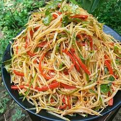 Potatoes (Eat as much as you like) | Green and red pepper, salt, chicken essence, Light soy sauce, mature vinegar, minced garlic, chili oil, sesame oil, coriander ( appropriate amount ) |