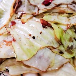 6. Pour a circle of rice vinegar along the edge of the pot, stir-fry quickly, then add 1 tablespoon of umami soy sauce, a little sugar, and a little salt to the pot and stir-fry evenly; cook the cabbage over high heat After the leaves are fried until fragrant and crispy, pour another tablespoon of rice vinegar along the edge of the pot, drizzle with a little sesame oil and remove from the pot and serve on a plate