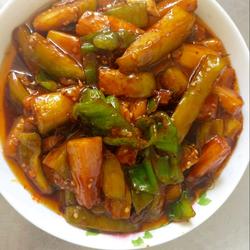 1.Green eggplant Wash and peel, cut into strips, cut green pepper into pieces, pour appropriate amount of oil and heat until 90% hot, add eggplant and green pepper