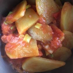 You can fry the tomatoes first or fry them first according to your taste preference.Fried potato slices, seasoning can also be added according to your own taste, such as thirteen spices