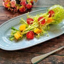 7. We put the cup of bitter chrysanthemum down and placed the bitter chrysanthemum in an extended position.On a long plate, connect the bitter chrysanthemums at the bottom of the cup, and then place cherry tomatoes and mango pieces.