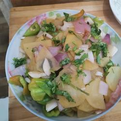 1. Slice 2 potatoes, cut onions into cubes, slice peppers with a hob, slice garlic, cut coriander into small pieces, prepare shredded ginger, and appropriate amount of pepper