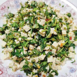 5. Mix the chopped toon into cubes or pieces of tofu, sprinkle with sesame seeds and chop finely of dried chili peppers.