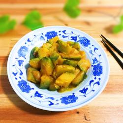 Hot the pot Add green onions in cold oil and fry until fragrant.Add pumpkin and stir-fry until the surface turns slightly brown.Add two tablespoons of light soy sauce and two tablespoons of hot water.Bring to a boil.Simmer over low heat until cooked through.Add appropriate amount of salt and mix well.