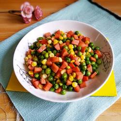 4. Peel off the corn and wash it, peel and dice the ham, blanch the peas, remove and drain.